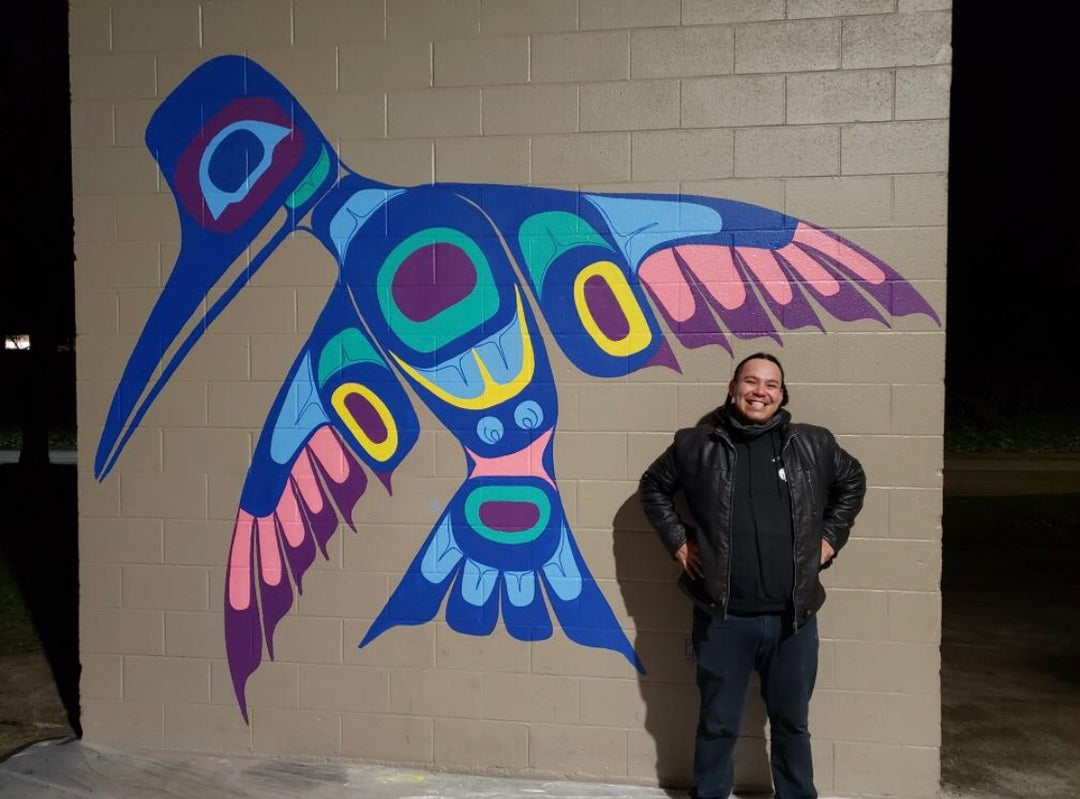 “In Native American culture, hummingbirds are regarded as healers and harbingers of love, good luck, and joy. The hummingbird totem has been used in my culture throughout history to teach us to enjoy life, and to keep ourselves light and free. This painting is my depiction of the original line designs from my Southeast Alaska/Tlingit heritage with warm and colorful inspirations from my residence in Oregon in the fall season.”