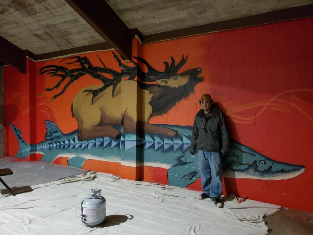 Toma Villa is a muralist, painter, carver, and sculptor from the Yakama Nation, currently residing north of Seattle. His painting depicts an elk riding on the back of a sturgeon.